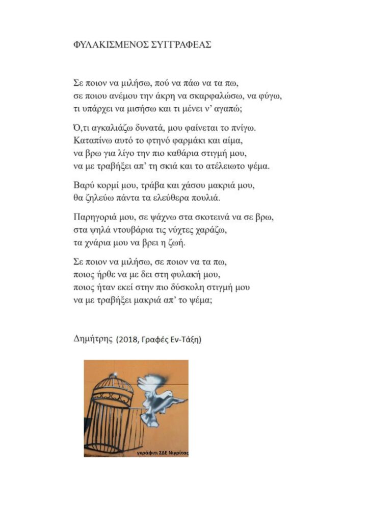 Η ποίηση για τους μαθητές μας είναι μικρές ανάσες έξω από το κελί, βουτιές στην ψυχή, φωνές που θέλουν ν’ ακουστούν μακριά, πρόσωπα που επιλέγουν να εκτεθούν για να απελευθερωθούν. Βαδίζοντας στον 6ο χρόνο υλοποίησης του προγράμματος Δημιουργικής Γραφής, έχοντας εκδώσει ως τώρα 4 συλλογές με έργα των μαθητών μας με την καθοδήγηση του εμπνευσμένου καθηγητή κ. Τριαντάφυλλου Κωτόπουλου και με την υποστήριξη πολλών εξαίρετων καταρτισμένων συναδέλφων και φίλων εθελοντών Εύη Χρηστομάτη, Φώτης Γιάντσιος, Βαγγέλης Λασπάς, Κρίστη Αγγελοπούλου, Κωνσταντίνος Διώγος, Μαρία Καλουπτσή. μοιραζόμαστε σήμερα τρία βιωματικά αφηγήματα μαθητών μας. Μείνετε κοντά μας για τις επόμενες σελίδες.. τα καλύτερα δεν έχουν έρθει ακόμη..