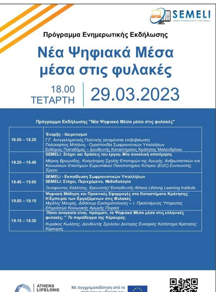 Ανακοινώθηκε η Ενημερωτική Εκδήλωση του Ευρωπαϊκού Προγράμματος SEMELI με τίτλο “Νέα Ψηφιακά Μέσα μέσα στις Φυλακές”.